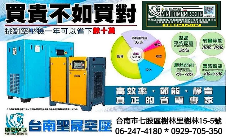 台南空壓機首選~台南往復式空壓機 / 南區活塞式系列空氣壓縮機 / 台南螺旋式空氣壓縮機 / 台南永磁節能變頻螺旋式空氣壓縮機 / 台南往覆式空壓機 / 台南皮帶式空壓機 / 冷凍式乾燥機 / 台南無油式空氣壓縮機 / 牙科醫療用精密無油空壓機 / 食品用精密無油空壓機 / 柴油引擎式空壓機 / 有油無油直接式空壓機 / 台南空壓儲氣桶 / 台南空壓機專業級維修 / 台南空壓機專業保養 / 台南空壓機專業規劃配管工程。 聖晟空壓機 TEL: 06-247-4180 FAX: 06-245-1131 /724027台南市七股區樹林里樹林15之5號 LINE ID: @xdr8204e 信 箱: puma.tainan@msa.hinet.net 信 箱: puma701215@yahoo.com.tw 網 址: www.tainan-aircompressor.com.tw 網 址: puma701215.weebly.com 服務地點 : 全省均有服務